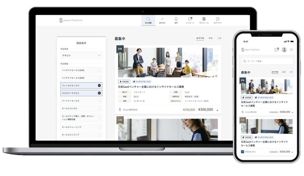 - Smacie — 営業に特化したITセールス専門の転職サイト・求人サイトを運営。転職サイトのみの利用も可能で、企業などから直接スカウトも届く。求人サイトとエージェント機能の両方を備えており、自分でも求人を探したい方、スカウトを待ちたい方にもおすすめ。20〜30代の利用者の割合が9割で、20〜30代の営業転職に強い。
